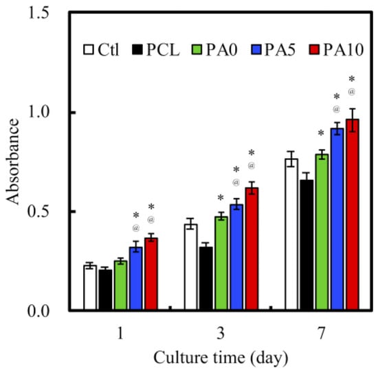 Quantification of cell proliferation over three various culture times of 1, 3 and 7 days was measured. As shown in Figure 9, there was a constant increase of absorption values over the 7 days for all groups. This showed that there was a constant and steady proliferation over this period, with a higher cell proliferation on the dECM/PDA-coated PCL conduits. There was a consistent significant difference between PA5 and PA10 when compared to Ctl and PCL over all time points (p < 0.05). There were no significant differences between PA5 and PA10 for all time points. Similar to the findings above, neat PCL conduits were found to have a lower proliferation rate compared to Ctl. In conjunction with the results of the proliferation assay and the results reported above, it can be postulated that the dECM coating plays an important role in modulating cell behavior resulting from the increased synergistic combination of structural proteins and PDA, and that higher concentrations of dECM coatings of 5 and 10 mg/mL were effective in supporting cell adhesion and proliferation through higher expression of growth factors.