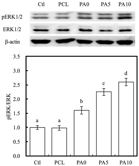 As seen in Figure 10, ERK1/2 activation was observed by western blot analysis, and this was evidenced by the increase in pERK1/2 expression. In addition, quantitative analysis of pERK/ERK ratio indicated that there were significant increases of 63%, 130% and 166% of PA0, PA5 and PA10, respectively, when compared to PCL. The mitogen-activated kinase (MAPK) is a major signaling pathway for transmission of a broad range of growth factors and extracellular signals that influenced cellular activities such as proliferation, differentiation and influencing cell cycle [40]. In this pathway, ERK1/2 plays a huge role in being an activator of this pathway and they act as ligands for G protein-coupled receptors, cytokines and other mitogenic factors. Increased ERK1/2 expression was recently reported to regulate and increase myelin thickness in the nervous system, thus suggesting that ERK1/2 was an important factor in the maintenance of the integrity of myelin and axons in the nervous system [41]. Active ERK1/2 (pERK1/2) can positively or negatively regulate several downstream transcription factors by regulating a wide range of kinases to regulate cellular activities. Similarly, recent studies have reported that chronic up-regulation of pERK1/2 is strongly associated with corneal fibrosis [42]. Despite the lack of details regarding the precise mechanism behind the proliferative roles of pERK1/2, these results are consistent with the above findings that dECM/PDA-coated PCL conduits are able to enhance cell adhesion and proliferation after functional surface modifications. In addition, pERK1/2 have commonly been used as a significant marker due to their important role in cell proliferation, and more recently, as a marker for myelination and axonal regenerations [43].