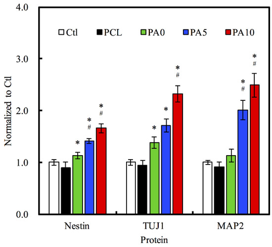 Effects of dECM/PDA-coated PCL conduits on the neural differentiation-related proteins expressions of Nestin, TUJ1, and MAP2. * indicates a significant difference (p < 0.05) compared to PCL. # indicates a significant difference (p < 0.05) compared to PA0.