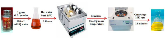 In a 250 mL conical flask, 1 g of G.L. mushroom powder and 100 mL of Milli-Q grade water were added. This mixture was placed in a hot water bath for 3 h at 85 °C and then was cooled down at room temperature. The solution was transferred to 50 mL eppendrof tubes. To confiscate the suspended particles of G.L. mushroom, the reacted solution was centrifuged at 10,000 rpm for 15 min. The clear supernatant was collected carefully and used as a reducing agent directly or stored at 4 °C for further use. Figure 2 provides the pictorial illustration of the preparation of the G.L. extract.
