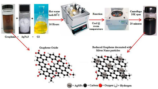 GAg was synthesized using GO (graphite oxide) (prepared via a modified Hummers method using flake graphite), AgNO3, and G.L. mushroom extract. The pH of the GO solution (0.1 mg/mL) was adjusted to pH 7 by using NaOH. For synthesizing the GAg nanocomposite, to 25 mL of 0.1 mg/mL GO solution, 10 mM AgNO3 was added dropwise in a 250 mL conical flask containing 25 mL of G.L. extract. The mixture was then placed in a preheated rotary water bath maintained at the speed of 120 rpm at 85 °C for 16 h. The resulting solution was then allowed to cool at room temperature and was then transferred to 50 mL eppendrof tubes for centrifugation. The reaction mixture was centrifuged at 10,000 rpm for 20 min and the supernatant discarded. The resulting solid residue was again dispersed in DI water and washed through a centrifuge to remove all the residuals of the G.L. extract. This step was repeated five times in order to obtain a pure GAg nanocomposite. Since the G.L. extract is water soluble, it is easy to remove entirely from the reaction solution with simply a water-washing technique. To validate the reproducibility of the GAg using G.L. mushroom extract, all the experiments were repeated thrice under identical experimental conditions. Finally, the resultant GAg nanocomposite pallet was gently re-dispersed in Milli-Q water for further use. Figure 3 shows the schematic description of the GAg nanocomposite.