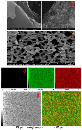 However, it is difficult to locate silver nanoparticles on the PHA/GAg nanocomposite since these particles are embedded deep within the polymer matrix and hard to visualise by FESEM analysis. Thus, elemental mapping appears to be the best technique to establish the uniform presence of Ag nanoparticles within the matrix of PHA polymer. Figure 5d–g and h represent the elemental mapping analysis of the PHA/GAg nanocomposite, which evidently reveals that Ag nanoparticles are homogeneously present within the matrix of the composite material along with carbon and oxygen.