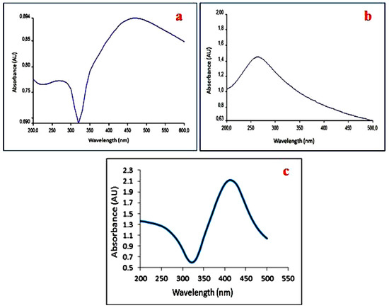 UV-vis spectra obtained after the green synthesis of Ag-NPs (a), rGO (b), and GAg (c).