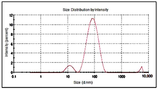 Furthermore, the particle size distribution of GAg was determined by DLS (Dynamic Light Scattering) analysis, which is the most valuable and useful technique to assess the particle size and size distribution of any nanomaterial in solution [54]. The results of DLS demonstrated that the size distribution of Ag-NPs within GAg was found to be range from 10 to 80 nm in diameter. The z-average diameter noted for Ag-NPs has been found to be 66.52 nm (Figure 7). The DLS technique can be used for the study of rGO-based composites, but the dimensions of rGO sheets and GO-based nanocomposites determined by this technique do not represent the real particle size [55]. Though DLS is appropriate for spherical particles rather than planar sheets, such as rGO, it serves to indicate whether a uniformly sized dispersion of grapheme flakes has been produced. The particle size distribution in the case of GAg as detected by DLS exhibited the presence of particles around 30 to 120 nm that may be attributed to the agglomeration of Ag-NPs or rGO flakes. Moreover, the presence of a small peak on the left may be attributed to non-binded silver nanoparticles whereas another smaller peak on the right may be due to agglomeration of nanoparticles with r-GO.