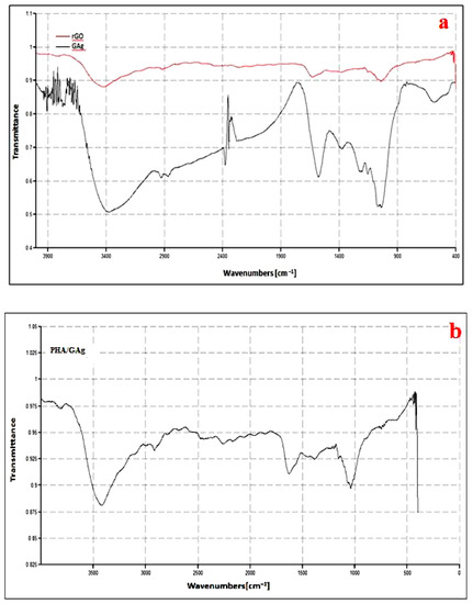 FTIR spectra of rGO and GAg (a) and PHA/GAg (b) nanocomposites.