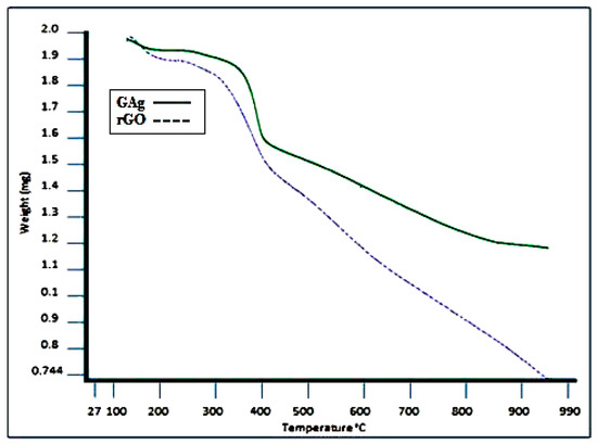 The thermal stability of GAg and rGO was analyzed using TGA. Figure 9 exhibits the TGA curves of rGO and the GAg nanocomposite under a nitrogen atmosphere. The decomposition of rGO and GAg begins with moderate weight loss at around 100 to 250 °C that is probably due to the removal of water molecules, the oxygen functional group, and residues. The maximum weight loss was observed from 250 to 400 °C for both rGO (38%) and GAg (28%), which may be due to the loss of the left over oxygen functional group and bulk pyrolysis of the carbon skeleton. The TGA curves of rGO and GAg exhibit a slight mass loss at the temperature of around 600 °C, which suggests that the enhancement of thermal stability is achieved after the oxygen-containing functional groups were removed during reduction [60,61]. The TGA results of GAg showed better thermal stability as compared to rGO alone. GAg has less oxygen groups and contains Ag-NPs that can affect the thermal stability of graphene, suggesting strong interaction between rGO and Ag.