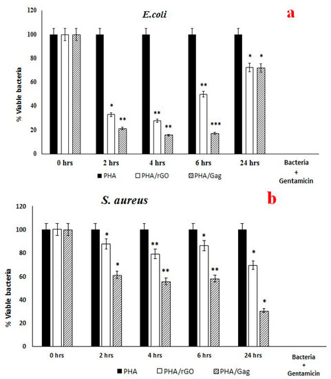 Bactericidal activity of PHA, PHA/rGO, and PHA/GAg against test organisms. PHA/rGO and PHA/GAg showed significant (p value <0.05) bactericidal effects towards Escherichia coli (a), and Staphylococcus aureus (b). p values were determined using a two-sample t-test distribution, (*) is <0.05; (**) is <0.01; and (***) is <0.001. The result presented was the average of three different batches of as-spun scaffolds of each nanocomposites (PHA, PHA/rGO and PHA/GAg.