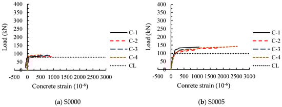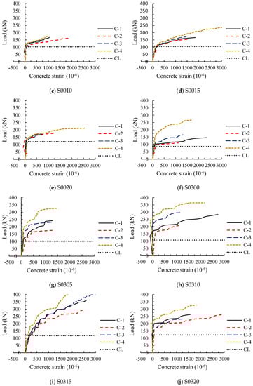 The load-concrete strain curves of 11 test beams obtained from four concrete strain gauges along the diagonal section (Figure 4) are shown in Figure 6.