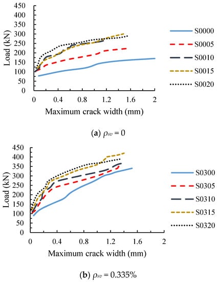 The load-maximum diagonal crack width curves of the test beams are shown in Figure 8. Figure 8a shows the load-maximum diagonal crack width curves of the beams without stirrup. It can be seen from the diagram that the diagonal crack width of RC beam S0000 rapidly expanded to 0.08 mm after cracking, while the crack width of SFRC beams were not greater than 0.06 mm, indicating that steel fiber can reduce the width of the initial diagonal crack. Before the test beam S0000 was loaded to 140 kN, the width of the diagonal crack increased rapidly. After that, no new cracks were formed, and the width of the diagonal crack increased further. Compared with the beam S0000, the maximum width of the diagonal crack of SFRC beams under the same load were reduced due to the bonding and anchoring effect of the steel fiber at the crack.