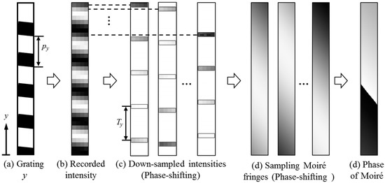 Spatial phase-shifting Moiré fringes in the y direction can be generated from Ty-pixels down-sampling and linear or 2nd-order or 3rd-order intensity interpolation, where Ty expresses the sampling pitch close to the grating pitch. The intensity of phase-shifting Moiré fringes can be represented by