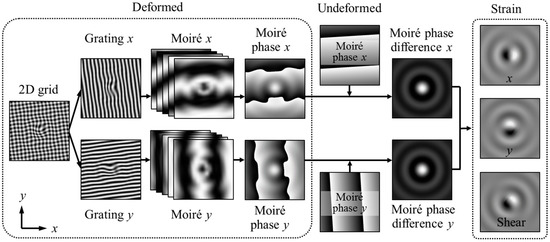 The 2D strain measurement process from a 2D grid is illustrated in Figure 2. The 2D grid can be separated to grating x and grating y using a low pass filter or Fourier transform. Then, the spatial phase-shifted sampling Moiré fringes can be generated and the Moiré phase differences before and after deformation in the x and y directions can be calculated as described in Section 2.1. Next, the 2D strain is measurable from the partial differentials of the Moiré phase differences in the x and y directions. As the phase differences in Equation (4) are wrapped by 2π in the range of (−π, π), the partial differentials of Moiré phase differences in different directions around phase boundaries should be corrected by a local phase unwrapping algorithm [33], expressed as