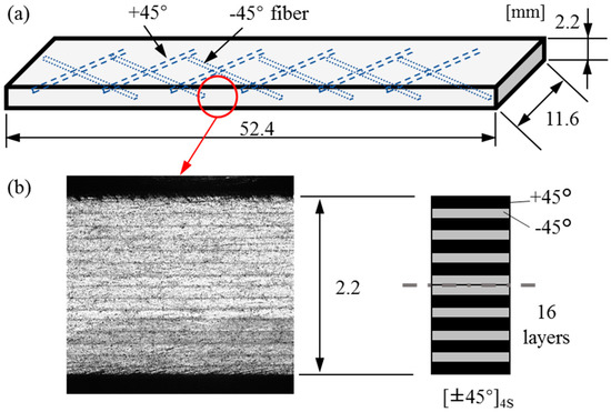 The specimen was [±45°]4S laminated CFRP with the width of 11.6 mm, length of 52.4 mm and thickness of 2.2 mm (Figure 3a). The materials were T700SC/2500 carbon/epoxy (Toray Co., Ltd., Tokyo, Japan) prepregs [34]. There were 16 layers (16-ply prepregs) and the thickness of each layer was 0.14 mm. First, 8 layers were alternately stacked with the stacking sequence of +45° and −45°. Then, another 8 layers were symmetrically stacked with the stacking sequence of −45° and +45° from the 9th layer to the bottom layer (Figure 3b), to form a balanced structure with less coupling effect [35]. The prepregs were cured in an autoclave at a preheating temperature of 90 °C for 1h followed by heating at 130 °C at a pressure of 0.2 MPa for 3.5 h, and the cured laminate was cut to the specimen with the desired size using a composite material cutting machine (AC-300CF, Maruto Testing Machine Co., Tokyo, Japan) [35].