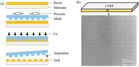 Microscale grid fabrication: (a) Process of ultraviolet (UV) nanoimprint lithography; (b) grid image fabricated on CFRP specimen.