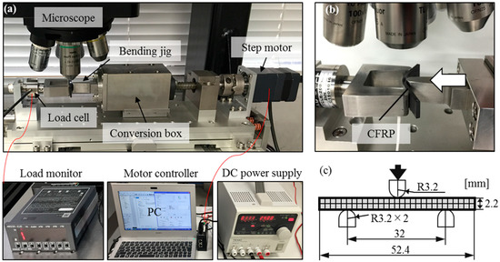 To perform a three-point bending test to the laminated CFRP, an automatic mechanical loading device was designed under the laser scanning microscope. The designed device includes a stepper motor, a motor controller, a rotation-translation conversion box, a pair of bending jig, a load cell, a load monitor and a direct current (DC) power supply, as shown in Figure 5. The model of the stepper motor was CRK543AKD-H100 (Oriental Motor Co., Ltd., Tokyo, Japan) and the designed minimum translational incremental step of the loading jig was 80 nm. The loading speed of the movable loading head during the three-point bending test was set to be 10 μm/s.
