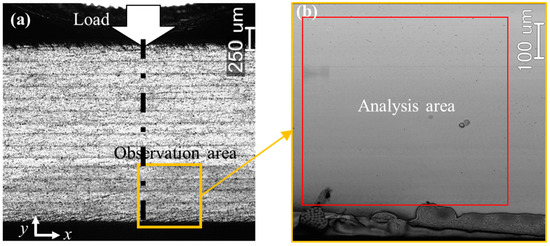 Surface images showing (a) the observation area and (b) the analysis area on CFRP specimen during three-point bending test.