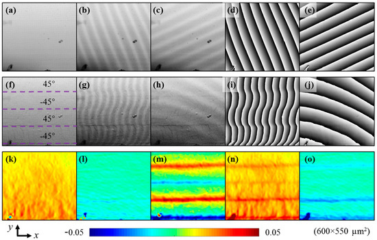 Strain measurement process and results: Images of (a) grid, (b) Moiré x, (c) Moiré y, (d) Moiré phase x and (e) Moiré phase y at 0MPa; Images of (f) grid, (g) Moiré x, (h) Moiré y, (i) Moiré phase x and (j) Moiré phase y at 258 MPa; distributions of (k) strain x, (l) strain y, (m) shear strain, (n) maximum principal strain and (o) minimum principal strain of CFRP. The phase range is −π–π, and the symbols x and y are abbreviations of ‘in the x direction’ and in the y direction’, respectively.