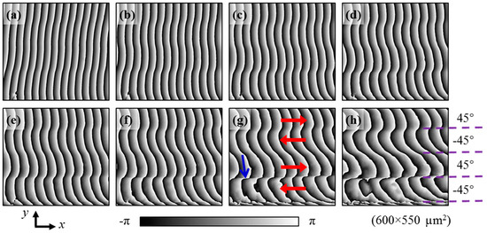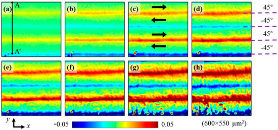 It is clearly seen that, the 45° layer slips to the right and the −45° layer ships to the left relatively. With the increase of the three-point bending load, the slip deformation becomes severe. The slip deformation at the (45°/−45°) layer interfaces is more severe than that at the adjacent middle (−45°/45°) layer interface. The most violent slip deformation appears at the bottom (45°/−45°) layer interface pointed out by the blue arrow in Figure 8g. All the slip deformation can be quantitatively evaluated by the shear strain distribution illustrated in Section 4.3. As the Moiré phase difference is equal to the difference of the revised Moiré phases before and after deformation, the strain can be calculated by either the Moiré phase difference or the revised Moiré phase difference.
