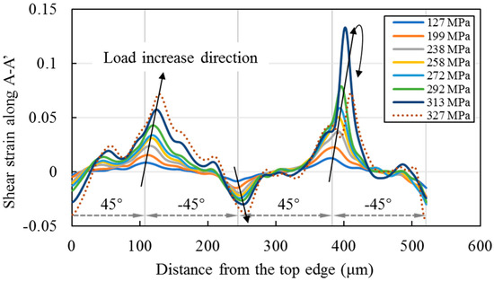 To display the shear strain feature more clearly, the strain data along a section line A-A’ labeled in Figure 9a is plotted with the increase of the three-point bending stress, as illustrated in Figure 10. To avoid showing the strain data, which may be influenced by the defect at the bottom-left corner of the grid image, the length of A-A’ is set to be 520 μm, shorter than the total height 550 μm. It can be seen from Figure 10, at the upper two layer interfaces, the absolute values of the shear strain gradually increase with the increase of the bending stress. At the lower (45°/−45°) layer interface, the shear strain also gradually increases with the load increase when the bending stress is less than 313 MPa, and the peak value is greater than those at the upper two interfaces. However, when the bending stress increases from 313 MPa to 327 MPa, the shear strain decreases, and the peak value decreases from 0.133 to 0.072 for this tested specimen.