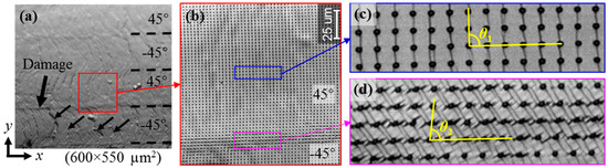 Furthermore, the relative slip direction of different layers analyzed in Section 4.2 can be verified from the enlarged view of the microgrid observed by using a high magnification objective lens. The grid dots before deformation are distributed along horizontal and vertical lines, as seen in Figure 4. The grid dots after deformation are distributed along oblique lines, which can be observed from the enlarged 2D grid images on CFRP at 327 MPa shown in Figure 11b–d. Since the ROI is at the bottom right area below the bending head, the grid should rotate anticlockwise slightly when there is less shear deformation, as seen from the grid image in the middle area of the 45° layer (Figure 11c). However, the grid along the vertical line rotate clockwise at the (45°/−45°) layer interface (Figure 11d). It indicates that shear deformation occurs at the (45°/−45°) layer interface and the 45° layer slips to the right relative to the −45° layer, which is identical to the direction visualized in Figure 8.