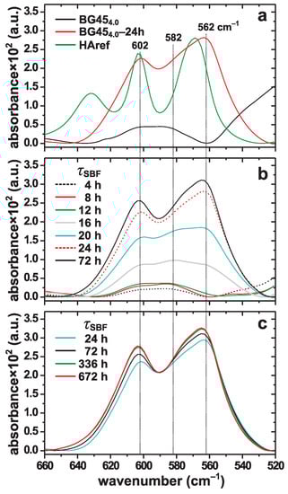 In full accordance with the powder XRD results (Figure 1), the IR spectra of Figure 2b give no evidence for HCA formation during the first 12 h of SBF immersion, while the overall low IR intensities observed also implies insignificant ACP contents in all BG45– specimen with h. However, a significant IR-intensity boost is observed at h: while remaining broad, these bands reveal maxima around 562 cm and 602 cm, as well as ≈582 cm, thereby evidencing substantially increased amounts of both ACP and HCA, which moreover unambiguously co-exist. The further growth of primarily HCA (at the expense of ACP) is evident at h, whereas the HCA-associated IR bands dominate for all longer SBF immersion periods. Most of the minor remnants of ACP are attributable to surface layers of the nanocrystalline HCA particles, as discussed in [21,22,39].