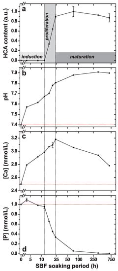 When a bioactive glass is exposed to SBF, rapid ion-leaching/proton-exchange processes are observed during the first few hours of immersion [2,41,48,54,61,68], leading to a concomitant increase in the pH value of the solution. Indeed, Figure 3b,c reveals growing pH-values and Ca concentrations for increasing SBF-soaking periods up to 24 h. After reaching a maximum at h, the [Ca] values drop for extended SBF exposure out to 28 days (Figure 3c), accompanied by a continuously growing pH of the solution towards an asymptotic value ≈7.9 (Figure 3b).