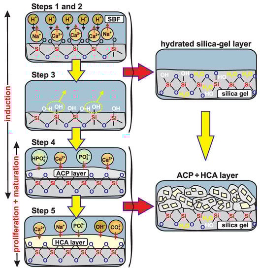 The first three HM steps only involve reactions between silicate surface species and the surrounding solution. They altogether lead to a hydrated silica gel surface layer rich in SiOH groups but depleted in CaNa cations [2,28,29,30,41,72,81]; see Figure 4. As discussed further below, this SiO-rich layer is believed to be pivotal for the in vivo/vitro bioactivity, by providing the structural sites triggering the heterogeneous CaP nucleation [29,30,41,72,81], with the last two HM steps proceeding as follows, where we first describe each stage by reproducing verbatim the Hench description [2]: