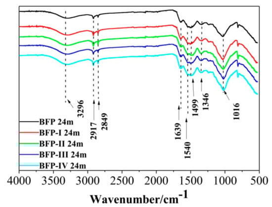 FTIR spectra of BFP, BFP-I, BFP-II, BFP-III, and BFP-IV composites.