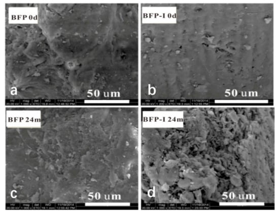 Surface morphology of the BFP and BFP-I composites. Note: (a) BFP untreated; (b) BFP-I untreated; (c) BFP treated 24 months of degradation; (d) BFP-I treated 24 months of degradation.