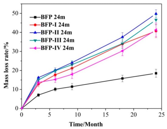 The variation of the mass loss rate with degradation time for BFP-I, BFP-II, BFP-III, and BFP-IV and BFP composites in soil was investigated (Figure 5). The degradability increased up to 40% as the soil burial time increased to 24 months. After 24 months of degradation, the BFP-I, II, III, and IV materials showed a higher mass loss rate than BFP and, in general, the mass loss rate increased with increasing of HSPI content, except for the BFP-IV composite. All of the BFP composites degraded rapidly within the first 3 months. This rapid degradation was mainly attributed to the composting process, which occurred in two main stages: An active composting stage and a curing period.