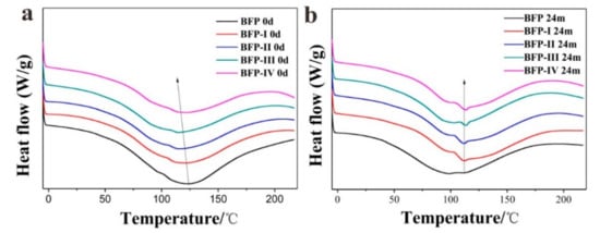 The onset temperature (OT), peak temperature (PT), and the heats of fusion (∆Hf, enthalpy) of BFP, BFP-I, II, III, and IV composites were determined using DSC. Figure 7 shows the DSC curves for BFP, BFP-I, II, III, and IV before and after degradation samples. The thermal transition of all samples was determined with DSC by measuring the amount of energy absorbed or released. The endothermic characteristic peaks of BFP, BFP-I, II, III, and IV samples, occurring in the 50–180 °C range, are presented in Figure 7a and the results obtained from DSC are summarized in Table 2. BFP, BFP-I, II, III, and IV had peak temperatures of 121.27 °C, 115.71 °C, 114.46 °C, 114.41 °C and 115.71 °C, respectively. For all composites, the PT was reduced with HSPI addition, and further decreased with increasing HSPI content. These lower PTs, when compared to the BFP composite, indicate that the crystallization rate of the composites slow during the non-isothermal process. The decrease in PT could be because the modified HSPI/U/F copolymer resin was not fully cured when the BFPs were formed.