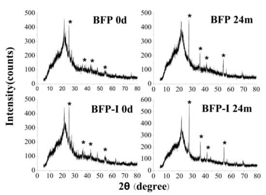 XRD curves of samples treated with different resin and at different degradation times (BFP, BFP after 24 months of degradation, BFP-I, and BFP-I after 24 months of degradation). (*) stand for characteristic peak.
