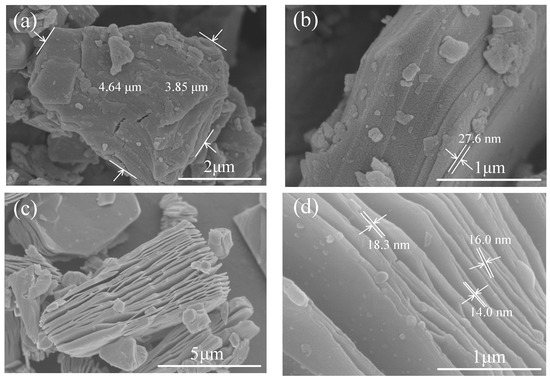 Figure 2a shows a typical top view of Ti3AlC2 powders, with the lateral dimensions of around 4 to 5 μm. Figure 2b shows the side view of Ti3AlC2 powders, indicating the close-packed layer structure. After HF etching, the layers are separated and parallel to each other, as shown in Figure 2c. From Figure 2d, the thickness of the Ti3C2Tx layer was found to be around 10–20 nm. Such morphological transformations are similar to those observed in the literature [1,17], which indicates the selective removal of Al layers in Ti3AlC2.