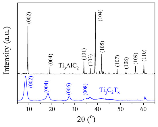 To confirm the etching of Al, EDS and XRD were carried out on both Ti3AlC2 and Ti3C2Tx powders. From the EDS analysis, the content of Al significantly decreased and a very small amount of Al component was found in the Ti3C2Tx. The removal of Al layer was also confirmed by the XRD results shown in Figure 3, where the characteristic (104) peak at 39° due to Al disappeared. Similar results were also reported in References [1,17]. Meanwhile, the (002) peak at 9.8° shifted to the lower angle, indicating the delamination of MXene layers.