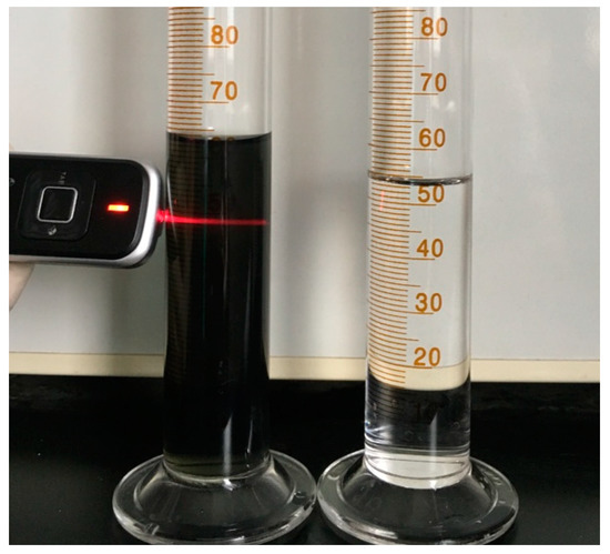 As described above, the Ti3C2Tx powders were delaminated into nano-flakes by the intercalation of DMSO and following ultrasonic treatment in water. The resulting black supernatant after centrifugation clearly demonstrated the Tyndall effect (Figure 4), i.e., scattering of laser light through the liquid, suggesting that the formation of the colloidal dispersion of delaminated Ti3C2Tx.