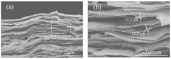 Figure 5. SEM images of (a) a cross-section of Ti3C2Tx film and (b) an enlarged part with estimated flake thickness.