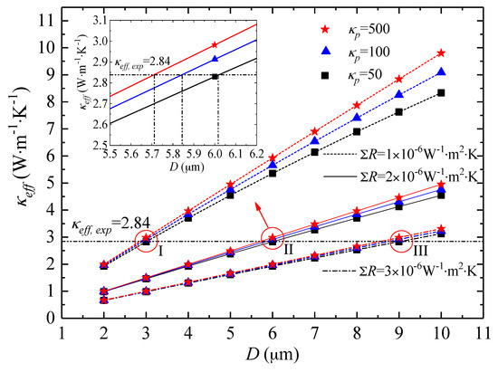 As we can see from Equation (4), if there is no gap and perfect contact exists between the Ti3C2Tx flakes, ΣR = 0 and thus keff = kp. However, in practice, ΣR is always larger than zero due to the presence of contact thermal resistance at the junctions between individual flakes and phonon scattering between adjacent flakes. According to Equation (4), the experimentally measured room temperature keff of 2.84 W·m−1·K−1 for the Ti3C2Tx film may correspond to many possible combinations of D, kp and ΣR, as indicated by the circles of I, II, and III in Figure 7. However, the characteristic dimension D, which can be evaluated by SEM images, is no larger than the size of etched Ti3C2Tx flakes (<10 μm in this work). When D is determined, the combinations of the rest two parameters, i.e., the mathematically correlated parameters of kp and ΣR, are limited to a small range restricted by keff and D. The three circles in Figure 7 show three combinations of kp and ΣR, with ΣR varying from 1 × 10−6 to 3 × 10−6 W−1·m2·K. To the best of our knowledge, the inherent thermal conductivity of Ti3C2Tx flake kp has not been experimentally determined in the literature. However, molecular simulation has been performed to predict the thermal conductivities of some MXene (Hf2CO2, Sc2CT2) nanosheets, to be from tens to hundreds W·m−1·K−1 [9]. Therefore, the inherent thermal conductity values of Ti3C2Tx flake, kp, used for the calculation in this work range from 50 to 500 W·m−1·K−1. Take the circle II for example, if the characteristic dimension D is around 6 μm, only the combination with ΣR of ~2 × 10−6 W−1·m2·K can yield a keff of 2.84 W·m−1·K−1, as shown in the enlarged view of circle II in the insert of Figure 7. Therefore, with the help of model analysis, it is possible to correlate the main influencing parameters of the thermal conductivity measurement and to evaluate the overall thermal resistance that limits the thermal conductivity of the MXene film. It can also be found that among the three influencing parameters, the effects of ΣR and D on keff of the Ti3C2Tx film are much more significant than kp.