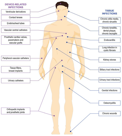 The increasing trend of nosocomial bacterial infections in immunocompromised hospitalized patients is worrying as HAI are the primary cause of morbidity in the health-care setting [3,4]. In the United States alone, it was estimated that a total of 1.7 million HAI occurred in the year 2002 alone, with 4.5 cases occurring for every 100 admissions, resulting in almost 99,000 deaths [5]. At the European level, more than 2 million patients contracted HAI, with 175,000 deaths per year [6]. The incidence of HAI are substantially lower at 7.1% and 4.5% in Europe and USA, respectively, compared to the low and middle-income countries (LMICs), where the average prevalence of HAI is 15.5% [7]. Among the leading bacteria that cause the HAI is Staphylococcus aureus (S. aureus), Pseudomonas aeruginosa (P. aeruginosa), Escherichia coli (E. coli), Klebsiella pneumoniae (K. pneumoniae), Acinetobacter baumanii, Clostridium difficile, and Enterococci [8,9]. The ability of these bacteria to form biofilms at the infected site or on medical devices has been increasingly recognized as one of the factors causing failure in the treatment of HAI, with biofilms estimated to contribute to approximately half of HAI [8,10]. Figure 1 shows the common site of infections related to the formation of bacterial biofilms.