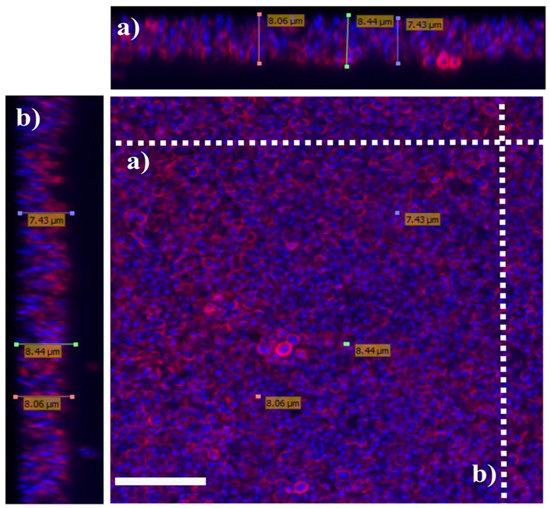 S. aureus biofilms were cultured in tryptic soy broth for 48 hours, fixed with 4% paraformaldehyde and treated with wheat germ agglutinin (WGA, red) to stain n-acetylglucoseamine component of polysaccharide and DAPI (blue) to stain the bacteria nuclear material, followed by confocal microscopy z-stack projection that moved through 111 slices across the cell. (a) Horizontal cross-section of biofilms and (b) Vertical cross-section of biofilms. White scale bar is 7.5 µm. The approximate thickness of the biofilms was 7.9 ± 0.5 µm. Image adapted from Kamaruzzaman et al., 2017 [39].