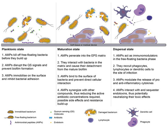 Several comprehensive works reviewing various aspects of AMPs have been performed [155,156,157]. Success of AMPs in both antimicrobial and anti-biofilm activities are collectively due to several characteristics namely: (i) rapid bactericidal effects; (ii) high plasticity in different microenvironments; (iii) good penetration into the matrix of extracellular polymeric substances (EPS); (iv) anti-quorum sensing; (v) host response modulator; and (vi) synergistic effects with other conventional and unconventional antimicrobial compounds [155]. The mechanisms exhibited by AMPs are illustrated in a different state in Figure 4.