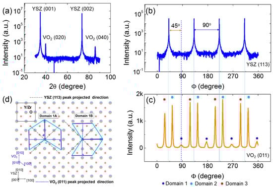 (a) XRD θ–2θ scans for the (010)-VO2/(001)-YSZ thin films; (b) The Φ scan of the substrate YSZ (113) peaks; (c) The Φ scan of the VO2 (011) peaks; (d) The schematic of the domain structures of the VO2 epitaxial thin film on the YSZ substrate.