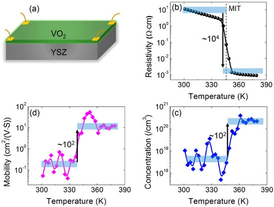 The MIT behaviors were characterized by obtaining the transport properties measurement using the van der Pauw method, which is shown in Figure 2a. The resistivity is a function of heating temperature, as shown in Figure 2b. At 301 and 379 K, the resistivity is 11.1 × 10−4 and 9.3 × 10−4 Ω·cm, respectively. As a consequence, the amplitude of resistivity change is approximately 1.2 × 104 at the low and high temperature, as shown in Figure 2b. This amplitude of MIT is comparable with the cases of the VO2/Al2O3 and VO2/TiO2 epitaxial thin films [21,26]. Additionally, the temperature of MIT is about 342 K in the heating cycle, which is consistent with the temperature of 340 K for the bulk VO2 [27]. It is known that the VO2 is an n-type semiconductor in the insulating phase (M1). After the resistivity measurements, the electron concentration and mobility were also measured using the van der Pauw method (please see the detailed procedures in Section 2 of the Supplementary Materials). Both are roughly increased by the order of magnitude of 102 across the MIT, which is shown in Figure 2c,d. It is mentionable that the beating of the mobility and concentration data is due to the displacement of the four probes, resulting from the magnet mechanical movements during measurements (please see Figure S3 in the Supplementary Materials). Therefore, the amplitude of the MIT is about 104, since the resistivity is positively proportional to the product of the electron concentration and mobility. The change in the electron concentration was the sole contribution to the amplitude of the MIT, both in the VO2 single crystals [28] and VO2/Al2O3 thin film system [29]. However, in this work, both electron concentration and mobility contribute to the MIT in the VO2/YSZ system. This important and interesting observation may encourage the further studies of the MIT mechanism, which may be quite different from the cases in the other VO2 film systems. For the mechanisms of this observation, on one hand, the unique domain structure may contribute to the co-actions of the mobility and carrier concentration to the MIT [19]. On the other hand, the oxygen vacancy and defect may play a prominent role in the mobility and carrier concentration across the MIT [30,31]. The detailed studies on these two mechanism are underway and will be present elsewhere.