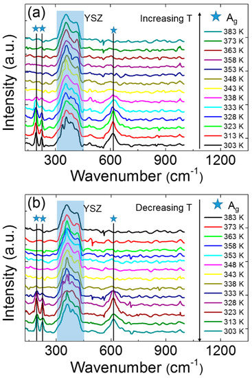Raman spectra in the cases of increasing (a) and decreasing (b) temperature. The stars labelled in the figure represent the Ag modes in the VO2 thin films. The shade boxes show the Raman signals from the YSZ substrates.