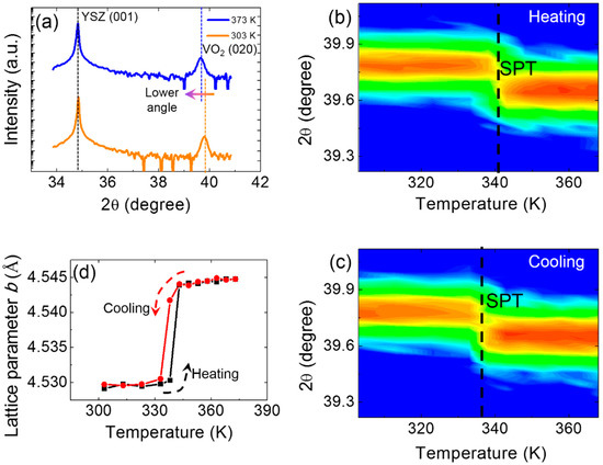 To further elucidate the SPT across the MIT, the local XRD θ–2θ scans were collected with variable temperatures in situ. In Figure 4a, the (020) peak is shifted down from 39.779° at 303 K to 39.638° at 373 K. Thus, the distance of (020) planes is increased from the low-temperature M1 phase to the high-temperature R phase. To more clearly show the SPT, numerous local θ–2θ scans in the heating and cooling cycles were obtained, which are shown in Figure 4b,c. The sharp shifts of (020) peaks are marked by dashed lines in Figure 4b,c. The SPT temperatures are approximately 343 K and 338 K during the heating and cooling process, respectively. These results are consistent with the transport property measurements and Raman spectra. To quantitatively study the SPT, the lattice constant b was measured. First, as increasing and decreasing temperature, the θ–2θ scans of (020) peaks of the VO2 thin film were obtained. The b-axis is just perpendicular to this characteristic (020) plane. Hence the spacing of the (020) planes directly reflects the lattice constant b. Second, the position (2θ) of the (020) peaks can be read out from the θ–2θ scans curves as patterned in Figure 4b,c. Third, using Bragg formula b·sin(2θ/2) = λ, the lattice constant b can be easily calculated. Consequently, the lattice constant b (defined in the notion of monoclinic symmetry) is plotted in Figure 4d. The marked feature was a sharp increase in the lattice constant b from 4.529 Å at the low temperature to 4.545 Å at the high temperature, evidencing the occurrence of SPT at 340 K [34]. Therefore, the occurrence of SPT is a natural concomitant of the MIT in the (010)-VO2/(001)-YSZ film system. This behavior was also found in the M1 VO2/Al2O3 thin films [31], but was different from the case in the thinner (001)-VO2/TiO2 film system. In the thinner case, the SPT is suppressed by epitaxial strain, although the MIT continues in the (001)-VO2/TiO2 thin films [20].