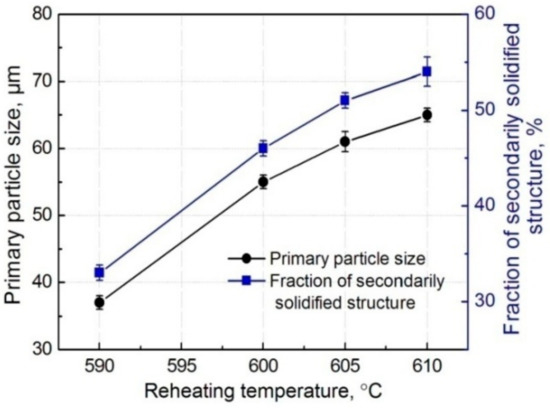 Variations of primary particle size and secondarily solidified structure amount vs reheating temperature.