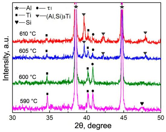 The white cores in Figure 3 should be the residual Ti and the surrounding shells or other-morphological structures, including the outside jagged structures, are reaction compounds between the Ti powders and Al melt. The jagged structures originated from the reaction of TiO2 film on the Ti powder surface with Al melt, and they belong to Al2O3-containing Al-Si-Ti compound [12]. The XRD results indicate that only one compound phase of τ1 (Al5Si12Ti7) has formed at 590 °C, besides Al, Ti, and Si phases in the original powders (Figure 4), which implies that the light grey shell in Figure 3a is τ1 phase and the out jagged structures belong to Al2O3-containing τ1 phase. When the temperature rises, another Al-Si-Ti ternary phase of (Al,Si)3Ti generates besides τ1 phase, and its diffraction intensities become more and more intensive, while those of τ1 phase get weaker and weaker (Figure 4). It is found that the diffraction peaks of (Al,Si)3Ti andτ1 phases are all not clear at 600 °C. This should be contributed to their relatively low concentrations. So it can be deduced that the light grey layers close to the Ti cores in Figure 3b–d are τ1 phase and the out grey layers or cracked shells belong to (Al,Si)3Ti phase. That is, the first formed τ1 phase gradually transforms into (Al,Si)3Ti phase from the shell outside to inside as the reheating temperature rises.