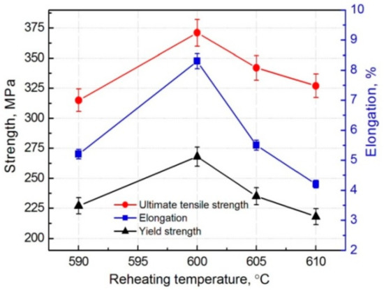 Figure 6 presents the variations of tensile properties of the composite with the reheating temperature. It shows that the ultimate tensile strength (UTS), yield strength (YS), and elongation all first increase as the temperature rises from 590 °C to 600 °C, and then continuously decrease. The UTS, YS, and elongation all reach the peak values of 371 MPa, 268 MPa, and 8.3% at 600 °C, respectively.