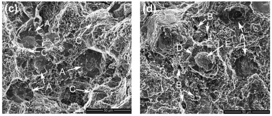Figure 8 presents the typical fractographs of the composites. It shows that there is no obvious difference between them and they are all composed of torn matrix and fractured reinforcing particles (marked by arrows A). But three small differences are found through careful comparison. First, there are lots of small pores on the fracture surfaces of the composites thixoformed at 590 °C and 610 °C (marked by arrows B in Figure 8a,d). This further demonstrates the variation of the microstructure compactness with the reheating temperature discussed above, and is consistent to the density variation (Table 1). Second, the tearing trace of the matrix is more obvious for the composites thixoformed at 600 °C and 605 °C (marked by arrows C in Figure 8b,c). This implies that these two composites should have high tensile properties, especially high elongation (Figure 6). The reason should be mainly attributed to the improved matrix microstructure compactness. Third, the reinforcing particles for the composites formed at 590 °C–605 °C frequently fracture across their center region (marked by arrows A in Figure 8a–c). But for the composite formed at 610 °C, some of them fracture in a dual-form, the surrounding shells fracture across themselves (marked by D in Figure 8d), while the center cores debond from the shells (marked by E).