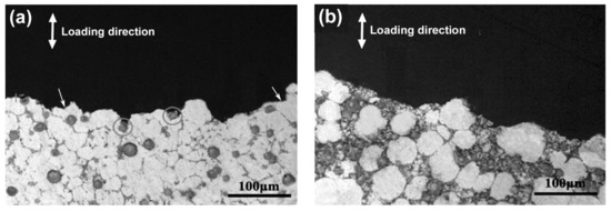 The observation for the side-views of the fracture surfaces indicates the crack propagation paths of all the composites during tensile testing are basically along the 3Ss between the primary particles, as shown by Figure 10. The only difference is that cracks occasionally propagate across some primary particles for the composites thixoformed at 590 °C (marked by arrows in Figure 10a). But this case becomes less and less as the temperature rises, and cracks almost completely propagate along the 3Ss when the temperature reaches 610 °C (Figure 10b). As discussed above, pores such as shrinkage porosities and gas pores all distribute in the 3Ss. So the 3Ss are the weak points of the composites, and thus, cracks preferentially propagate along these structures. In addition, the primary particles at 590 °C are basically connected to each other (Figure 1a) and they are gradually separated by the 3Ss, and finally evolve into the individual large-sized spheroidal particles at 610 °C (Figure 1d). So it can be expected that cracks can occasionally propagate across some interconnected primary particles for the composites formed at low reheating temperatures, and this situation will decrease due to the separation of the primary particles by 3Ss and completely disappear as the temperature rises to a given degree.