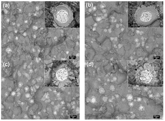 To verify the evolution process of the reinforcing particles with the reheating temperature, the specimens were also observed by SEM, as shown in Figure 3. It is seen that the reinforcing particle at 590 °C presents a well core-shell-structure with a uniform and compact light grey shell in addition to a round of jagged structures (Figure 2a). As the temperature rises, the reaction shell thickens and the outside jagged structures coarsen (Figure 3b–d). Additionally, a kind of grey structure is formed from the outside of the light grey shell and the shell evolves into a dual-layer structure at 600 °C (Figure 2b). Subsequently, some radial cracks generate within the thickened shell and the reinforcing particle becomes a structure that is composed of a small-sized core-shell-structured core (with a thin light grey shell) and surrounding cracked grey shell at 605 °C (Figure 3c). Finally, the cracked grey structures peel off and the center part evolves into a smaller core-shell-structured particle, which is similar to the reinforcing particle at 605 °C, when the temperature rises to 610 °C (Figure 3d). So it can be concluded that rising reheating temperature thickens the shells, but also promotes the shells to fracture. Reheating at 590–600 °C for 50 min can obtain perfect-morphology core-shell-structured reinforcing particles. In addition, elevating the temperature possibly facilitates the first formed compound shell to transform into another phase.