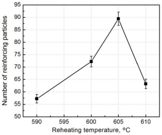 Variation of visible reinforcement number on the fracture surfaces vs reheating temperature.